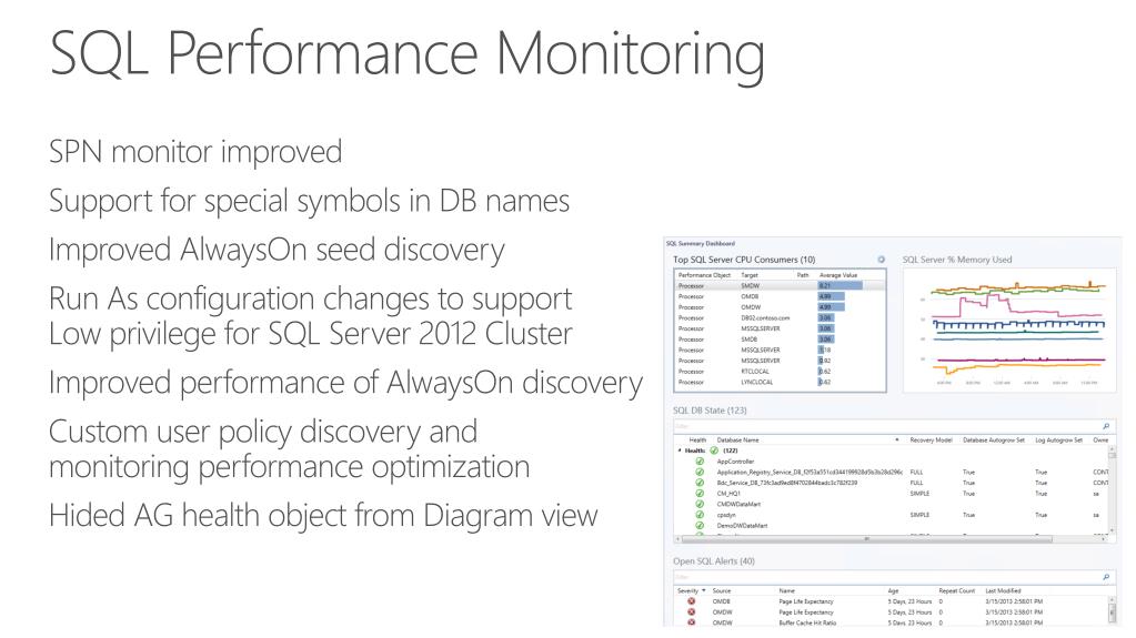 SQL Performance Monitoring SPN monitor improved Support for special symbols in DB names Improved AlwaysOn seed discovery Run As configuration changes to support Low privilege for SQL Server 2012 Cluster Improved performance of AlwaysOn discovery Custom user policy discovery and monitoring performance optimization Hided AG health object from Diagram view