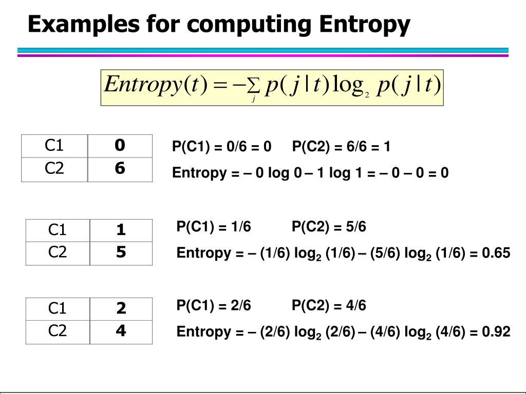 Examples for computing Entropy P(C1) = 0/6 = 0 P(C2) = 6/6 = 1 Entropy = – 0 log 0– 1 log 1 = – 0 – 0 = 0 P(C1) = 1/6 P(C2) = 5/6 Entropy = – (1/6) log2 (1/6)– (5/6) log2 (1/6) = 0.65 P(C1) = 2/6 P(C2) = 4/6 Entropy = – (2/6) log2 (2/6)– (4/6) log2 (4/6) = 0.92