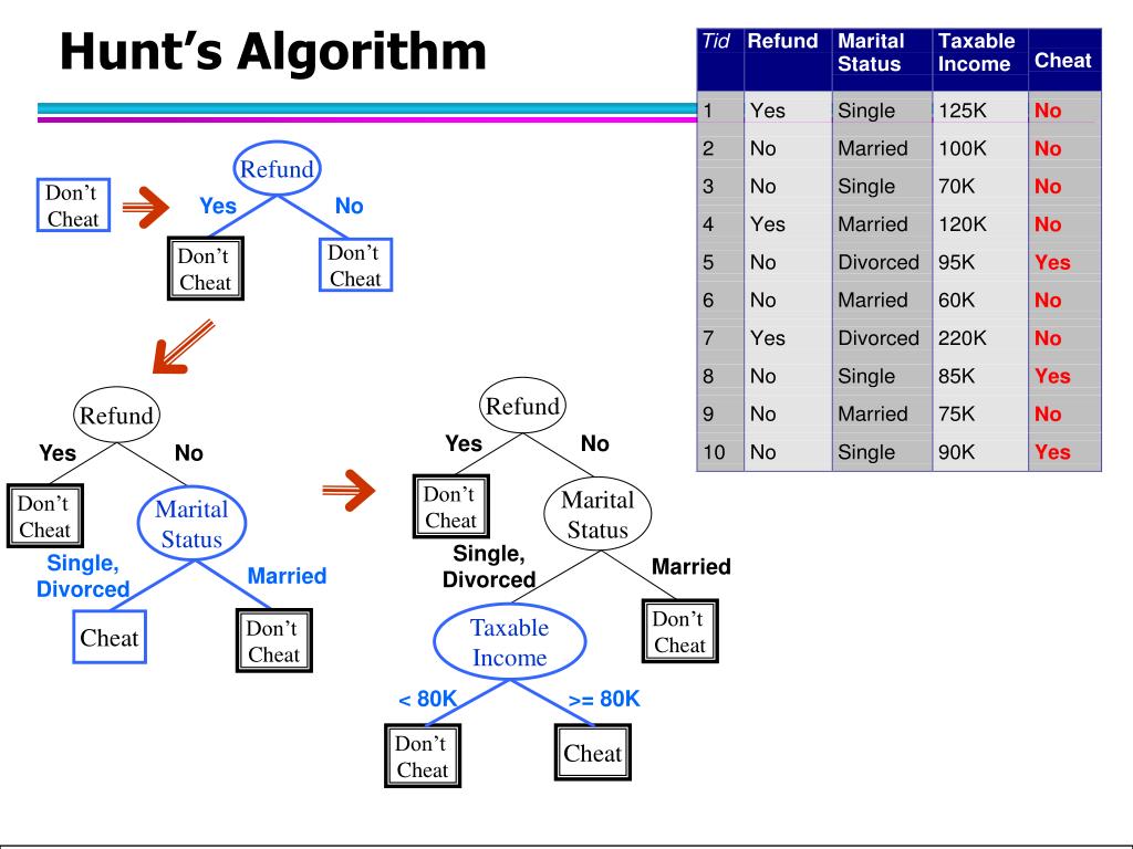 Refund Refund Yes No Yes No Don’t Cheat Marital Status Don’t Cheat Marital Status Single, Divorced Refund Married Married Single, Divorced Yes No Don’t Cheat Taxable Income Cheat Don’t Cheat Don’t Cheat Don’t Cheat < 80K >= 80K Don’t Cheat Cheat Hunt’s Algorithm Don’t Cheat