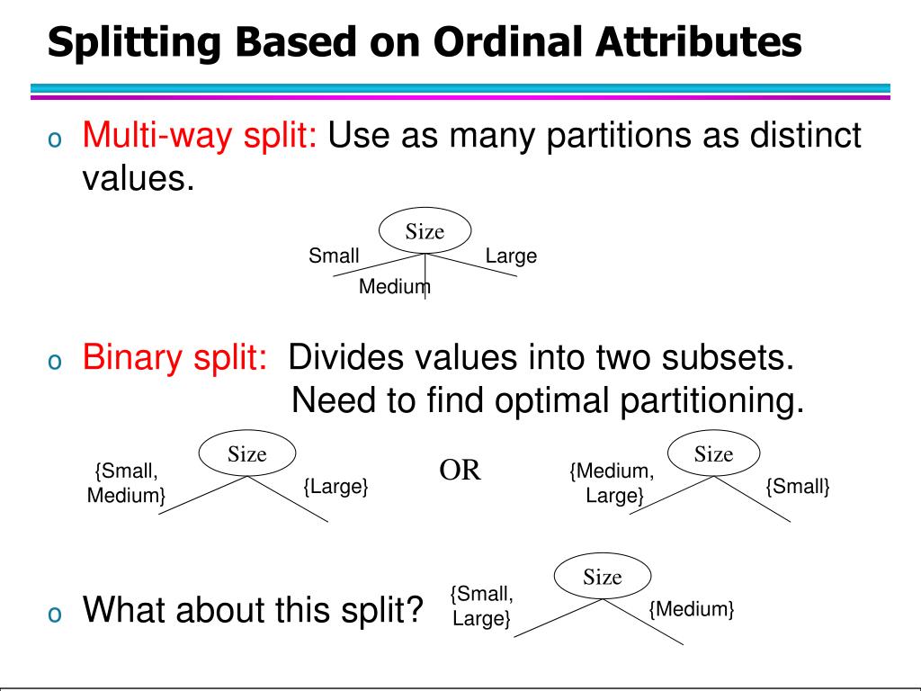 Size Small Large Medium Size Size Size {Small, Medium} {Small, Large} {Medium, Large} {Medium} {Large} {Small} Splitting Based on Ordinal Attributes • Multi-way split: Use as many partitions as distinct values. • Binary split: Divides values into two subsets. Need to find optimal partitioning. • What about this split? OR