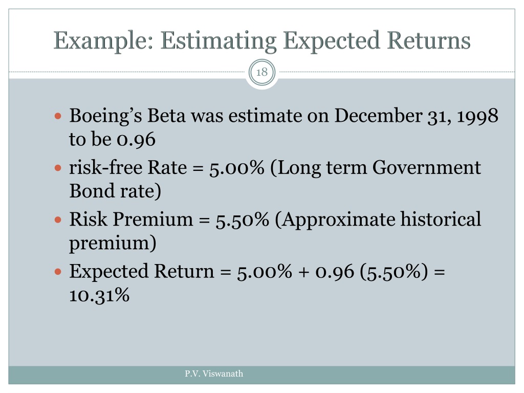 Boeing’s Beta was estimate on December 31, 1998 to be 0.96 risk-free Rate = 5.00% (Long term Government Bond rate) Risk Premium = 5.50% (Approximate historical premium) Expected Return = 5.00% + 0.96 (5.50%) = 10.31% Example: Estimating Expected Returns P.V. Viswanath