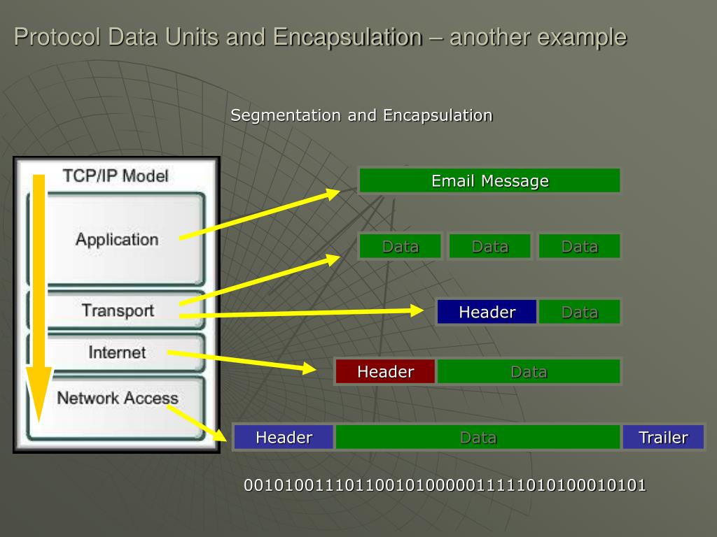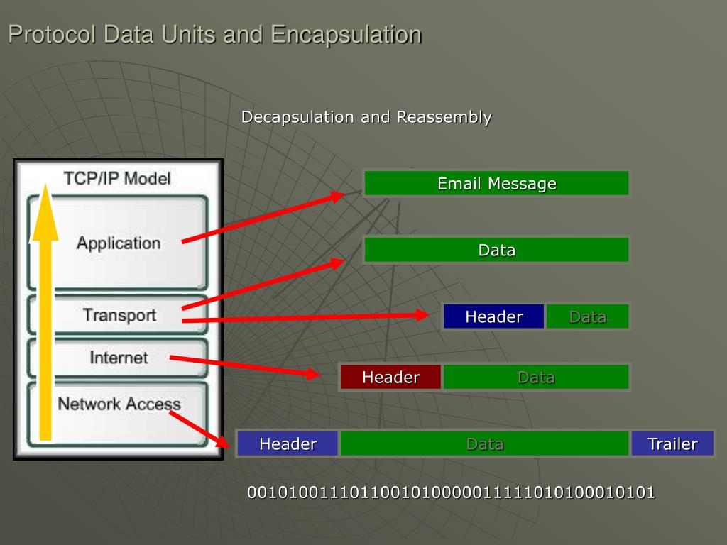 Email Message Data Data Data Data Data Data Protocol Data Units and Encapsulation Decapsulation and Reassembly Data Header Header Header Trailer 0010100111011001010000011111010100010101