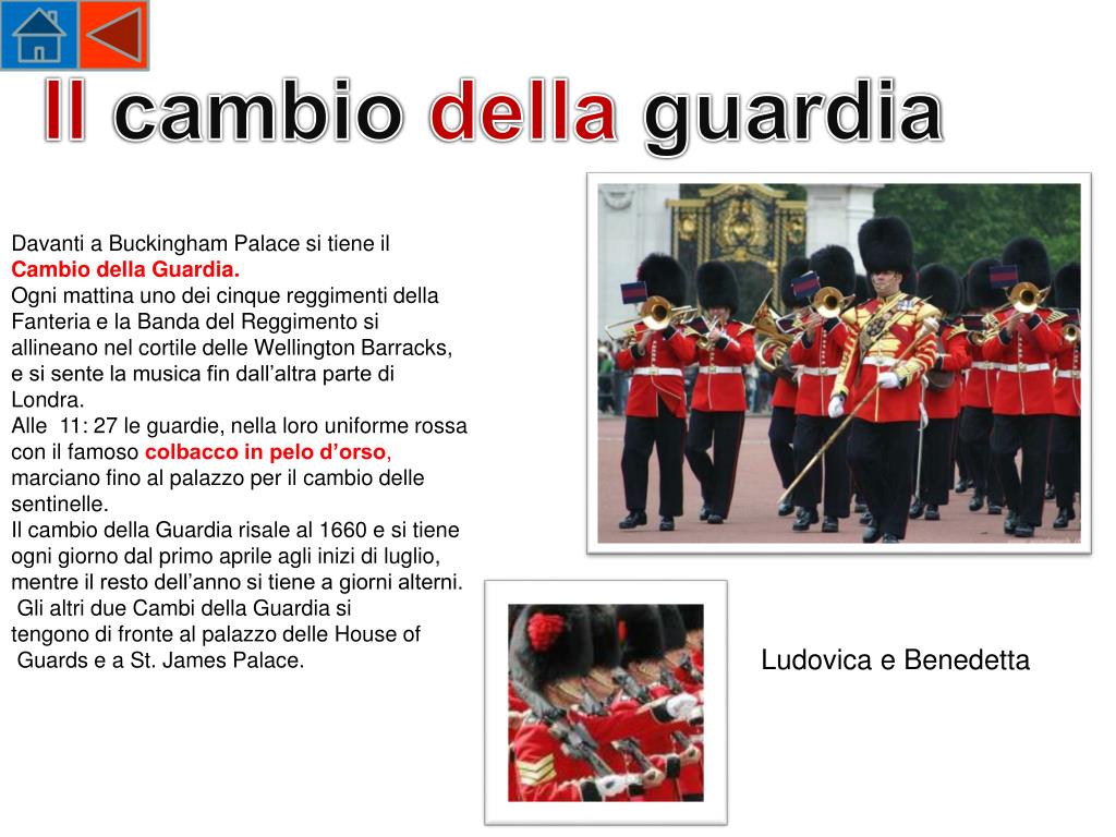 Il cambio della guardia Davanti a Buckingham Palace si tiene il Cambio della Guardia. Ogni mattina uno dei cinque reggimenti della Fanteria e la Banda del Reggimento si allineano nel cortile delle Wellington Barracks, e si sente la musica fin dall’altra parte di Londra. Alle 11: 27 le guardie, nella loro uniforme rossa con il famoso colbacco in pelo d’orso, marciano fino al palazzo per il cambio delle sentinelle. Il cambio della Guardia risale al 1660 e si tiene ogni giorno dal primo aprile agli inizi di luglio, mentre il resto dell’anno si tiene a giorni alterni. Gli altri due Cambi della Guardia si tengono di fronte al palazzo delle House of Guards e a St. James Palace. Ludovica e Benedetta
