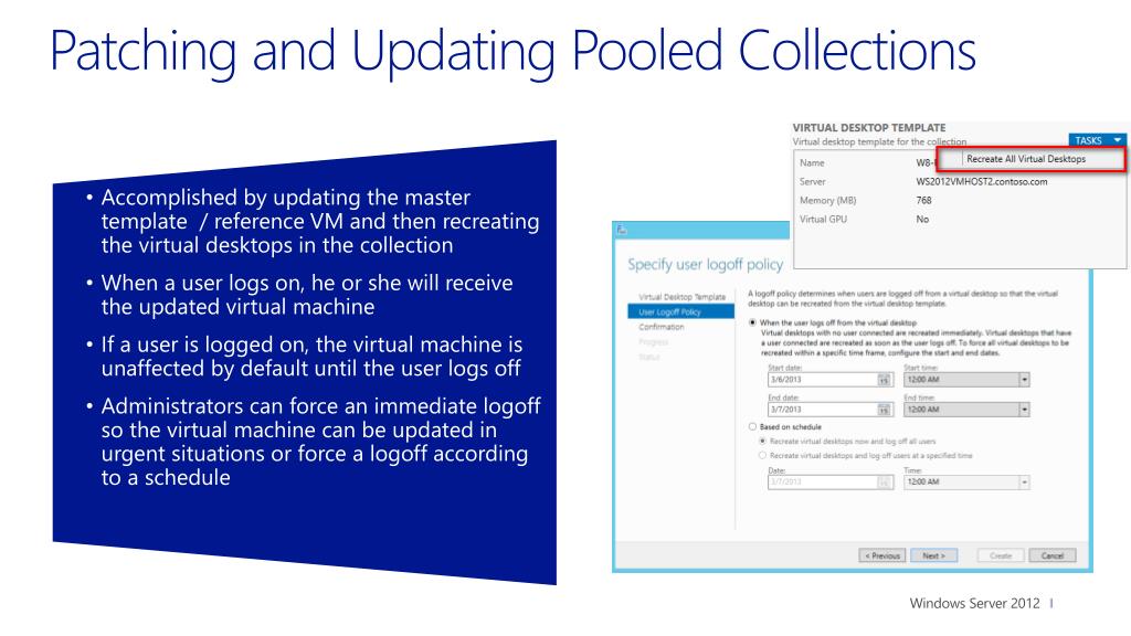 Lower Cost Deployments • Support for cheaper storage options • Use inexpensive local storage with live migration functionality between host computers for pooled virtual desktops • Personal virtual desktops can use SMB-based central storage • Automated pooled virtual desktop management • Deploy and manage pooled virtual desktops centrally by using a virtual desktop template • Remote Desktop Services installs any changes, such as new applications or updates, in the virtual desktop template and then recreates the pooled virtual desktops from the template • Highly available RD Connection Broker • The RD Connection Broker can be clustered in an active/active configuration to improve deployment scalability, performance, and availability • Personal desktop patching • Patch personal desktop VMs while they are running, or let RD Connection Broker wake them to apply patches