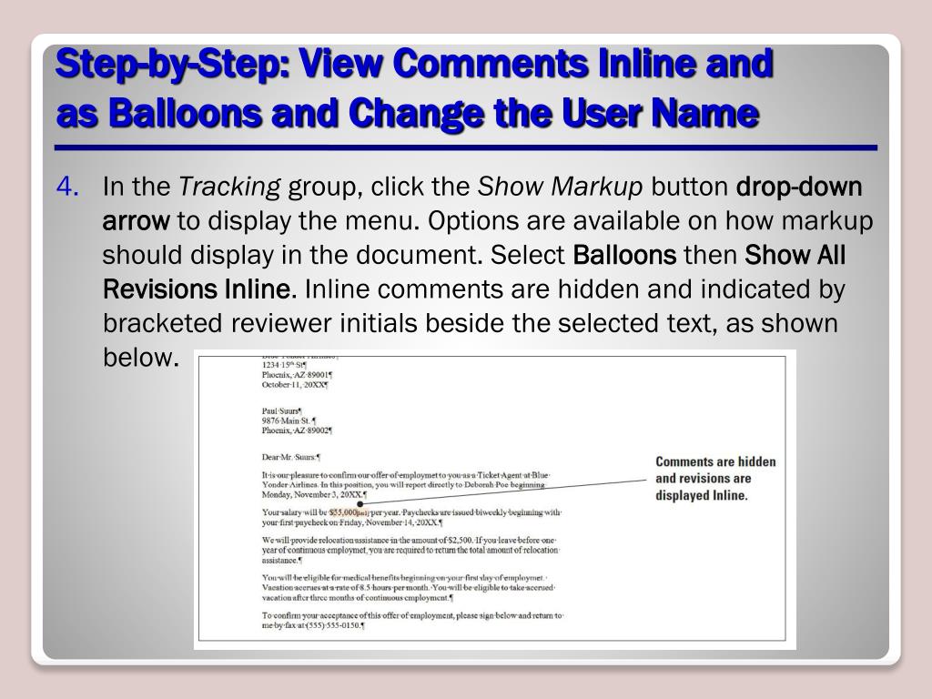 Step-by-Step: View Comments Inline and as Balloons and Change the User Name • In the Tracking group, click the Show Markup button drop-down arrow to display the menu.Options are available on how markup should display in the document. Select Balloons then Show All Revisions Inline. Inline comments are hidden and indicated by bracketed reviewer initials beside the selected text, as shown below.