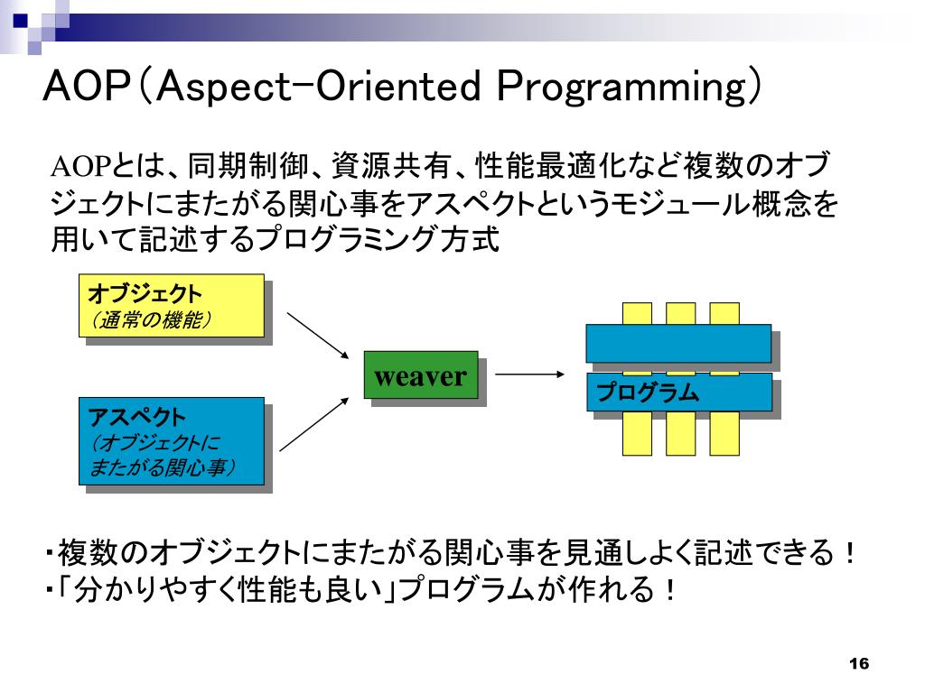 AOP(Aspect-Oriented Programming) AOPとは、同期制御、資源共有、性能最適化など複数のオブジェクトにまたがる関心事をアスペクトというモジュール概念を用いて記述するプログラミング方式 オブジェクト (通常の機能) weaver プログラム アスペクト (オブジェクトに またがる関心事) ・複数のオブジェクトにまたがる関心事を見通しよく記述できる! ・「分かりやすく性能も良い」プログラムが作れる!