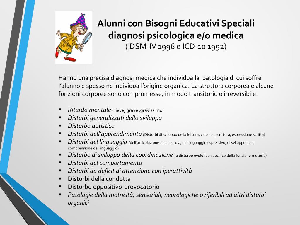 Alunni con Bisogni Educativi Speciali diagnosi psicologica e/o medica ( DSM-IV 1996 e ICD-10 1992) • Hanno una precisa diagnosi medica che individua la patologia di cui soffre l’alunno e spesso ne individua l’origine organica. La struttura corporea e alcune funzioni corporee sono compromesse, in modo transitorio o irreversibile. • Ritardo mentale- lieve, grave ,gravissimo • Disturbi generalizzati dello sviluppo • Disturbo autistico • Disturbi dell’apprendimento (Disturbi di sviluppo della lettura, calcolo , scrittura, espressione scritta) • Disturbi del linguaggio (dell’articolazione della parola, del linguaggio espressivo, di sviluppo nella comprensione del linguaggio) • Disturbo di sviluppo della coordinazione (o disturbo evolutivo specifico della funzione motoria) • Disturbi del comportamento • Disturbi da deficit di attenzione con iperattività • Disturbi della condotta • Disturbo oppositivo-provocatorio • Patologie della motricità, sensoriali, neurologiche o riferibili ad altri disturbi organici