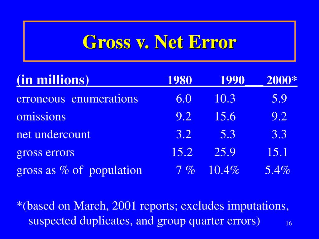 Gross v. Net Error (in millions) 1980 1990___ 2000* erroneous enumerations 6.0 10.3 5.9 omissions 9.2 15.6 9.2 net undercount 3.2 5.3 3.3 gross errors 15.2 25.9 15.1 gross as % of population 7 % 10.4% 5.4% *(based on March, 2001 reports; excludes imputations, suspected duplicates, and group quarter errors)