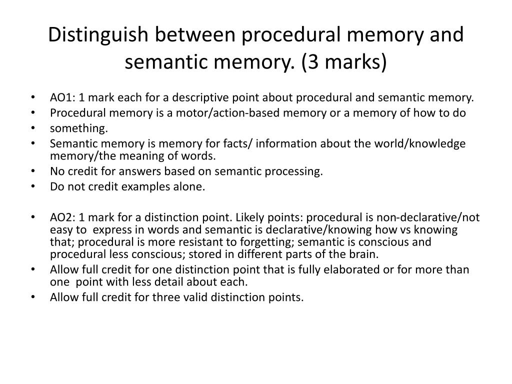 Distinguish between procedural memory and semantic memory. (3 marks) • AO1: 1 mark each for a descriptive point about procedural and semantic memory. • Procedural memory is a motor/action-based memory or a memory of how to do • something. • Semantic memory is memory for facts/ information about the world/knowledge memory/the meaning of words. • No credit for answers based on semantic processing. • Do not credit examples alone. • AO2: 1 mark for a distinction point. Likely points: procedural is non-declarative/not easy to express in words and semantic is declarative/knowing how vs knowing that; procedural is more resistant to forgetting; semantic is conscious and procedural less conscious; stored in different parts of the brain. • Allow full credit for one distinction point that is fully elaborated or for more than one point with less detail about each. • Allow full credit for three valid distinction points.