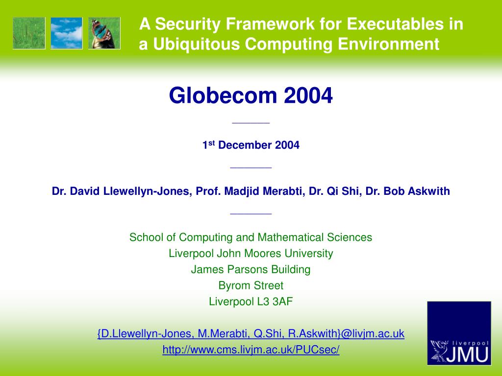 A Security Framework for Executables in a Ubiquitous Computing Environment. Globecom 2004 —————— 1 st December 2004 —————— Dr. David Llewellyn-Jones, Prof. Madjid Merabti, Dr. Qi Shi, Dr. Bob Askwith —————— School of Computing and Mathematical Sciences Liverpool John Moores University