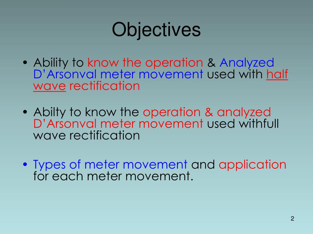 ALTERNATING CURRENT METERS Part 2. Objectives. Ability to know the operation & Analyzed D’Arsonval meter movement used with half wave rectification Abilty to know the operation & analyzed D’Arsonval meter movement used withfull wave rectification