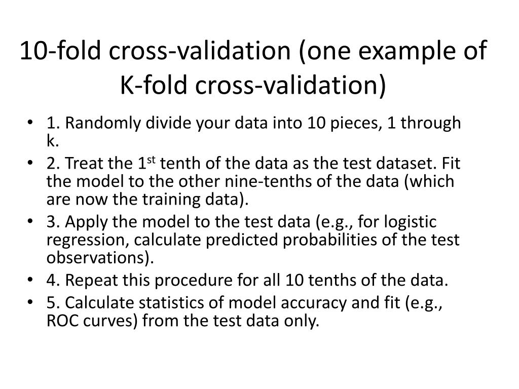 10-fold cross-validation (one example of K-fold cross-validation) • 1. Randomly divide your data into 10 pieces, 1 through k. • 2. Treat the 1st tenth of the data as the test dataset. Fit the model to the other nine-tenths of the data (which are now the training data). • 3. Apply the model to the test data (e.g., for logistic regression, calculate predicted probabilities of the test observations). • 4. Repeat this procedure for all 10 tenths of the data. • 5. Calculate statistics of model accuracy and fit (e.g., ROC curves) from the test data only.