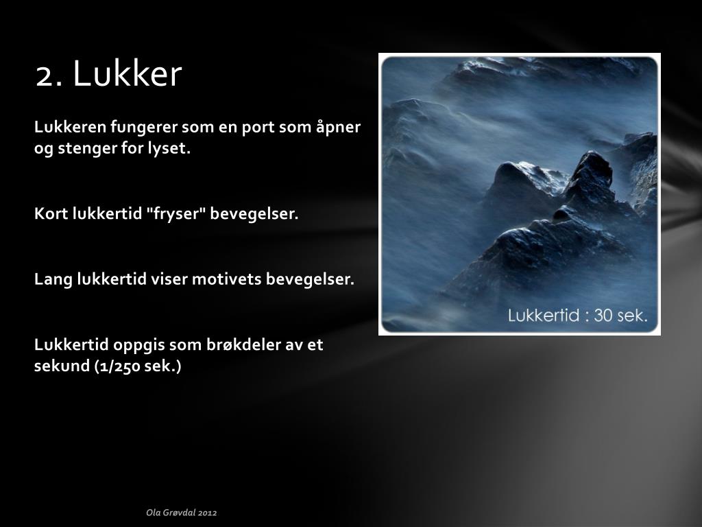 2. Lukker • Lukkeren fungerer som en port som åpner og stenger for lyset. • Kort lukkertid "fryser" bevegelser. • Lang lukkertid viser motivets bevegelser. • Lukkertid oppgis som brøkdeler av et sekund (1/250 sek.) Ola Grøvdal 2012