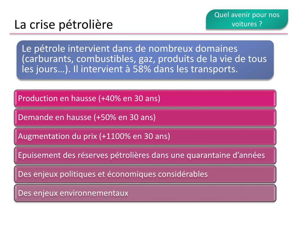 Quel avenir pour nos voitures ? La crise pétrolière Le pétrole intervient dans de nombreux domaines (carburants, combustibles, gaz, produits de la vie de tous les jours…). Il intervient à 58% dans les transports.