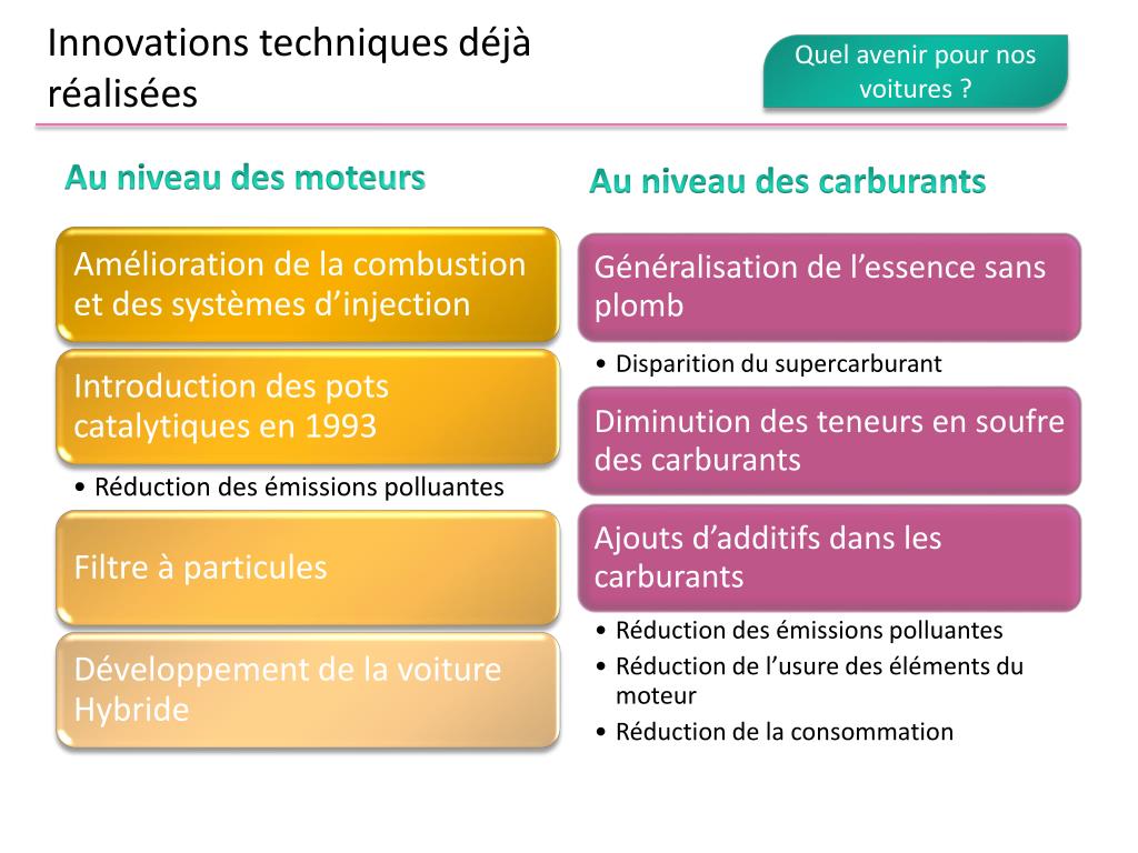 Quel avenir pour nos voitures ? Innovations techniques déjà réalisées Au niveau des moteurs Au niveau des carburants