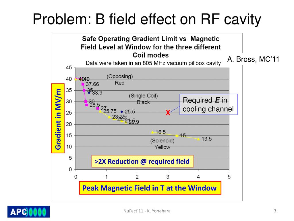 Problem: B field effect on RF cavity A. Bross, MC’11 Data were taken in an 805 MHz vacuum pillbox cavity Required E in cooling channel X Gradient in MV/m >2X Reduction @ required field Peak Magnetic Field in T at the Window NuFact'11 - K. Yonehara