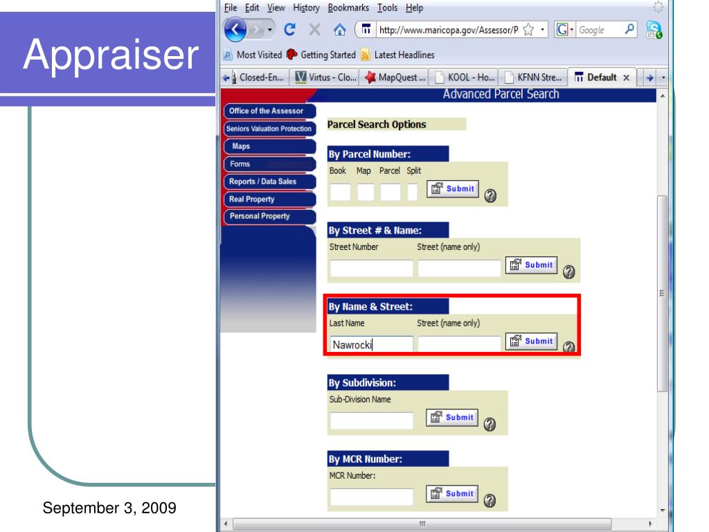 Determining Value (Cnt’d) • County Appraiser, Recorder & Taxes • http://www.maricopa.gov/Assessor/Parcel Application • http://recorder.maricopa.gov/recdocdata • http://treasurer.maricopa.gov • For Income Producing • Value based on Rental Income • Hint: Value ~= 120 rent payments