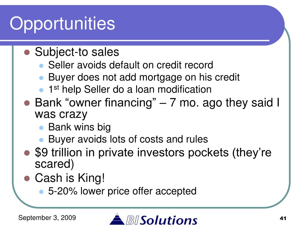 Opportunities • Subject-to sales • Seller avoids default on credit record • Buyer does not add mortgage on his credit • 1st help Seller do a loan modification • Bank “owner financing” – 7 mo. ago they said I was crazy • Bank wins big • Buyer avoids lots of costs and rules • $9 trillion in private investors pockets (they’re scared) • Cash is King! • 5-20% lower price offer accepted
