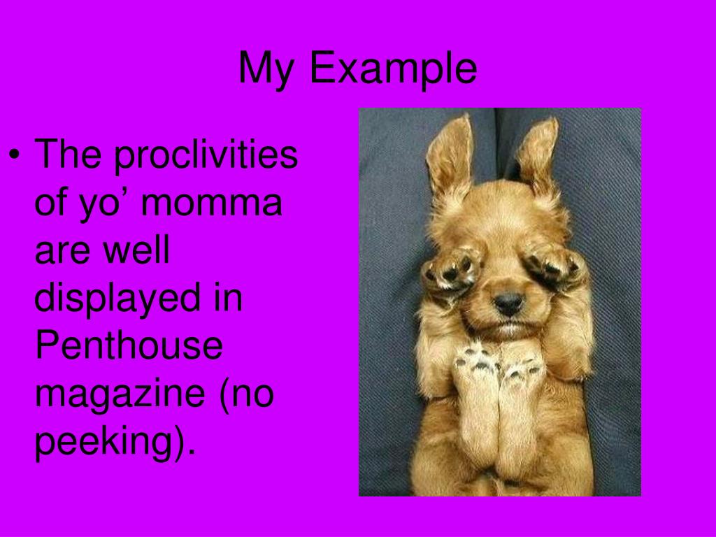My Example • The proclivities of yo’ momma are well displayed in Penthouse magazine (no peeking).