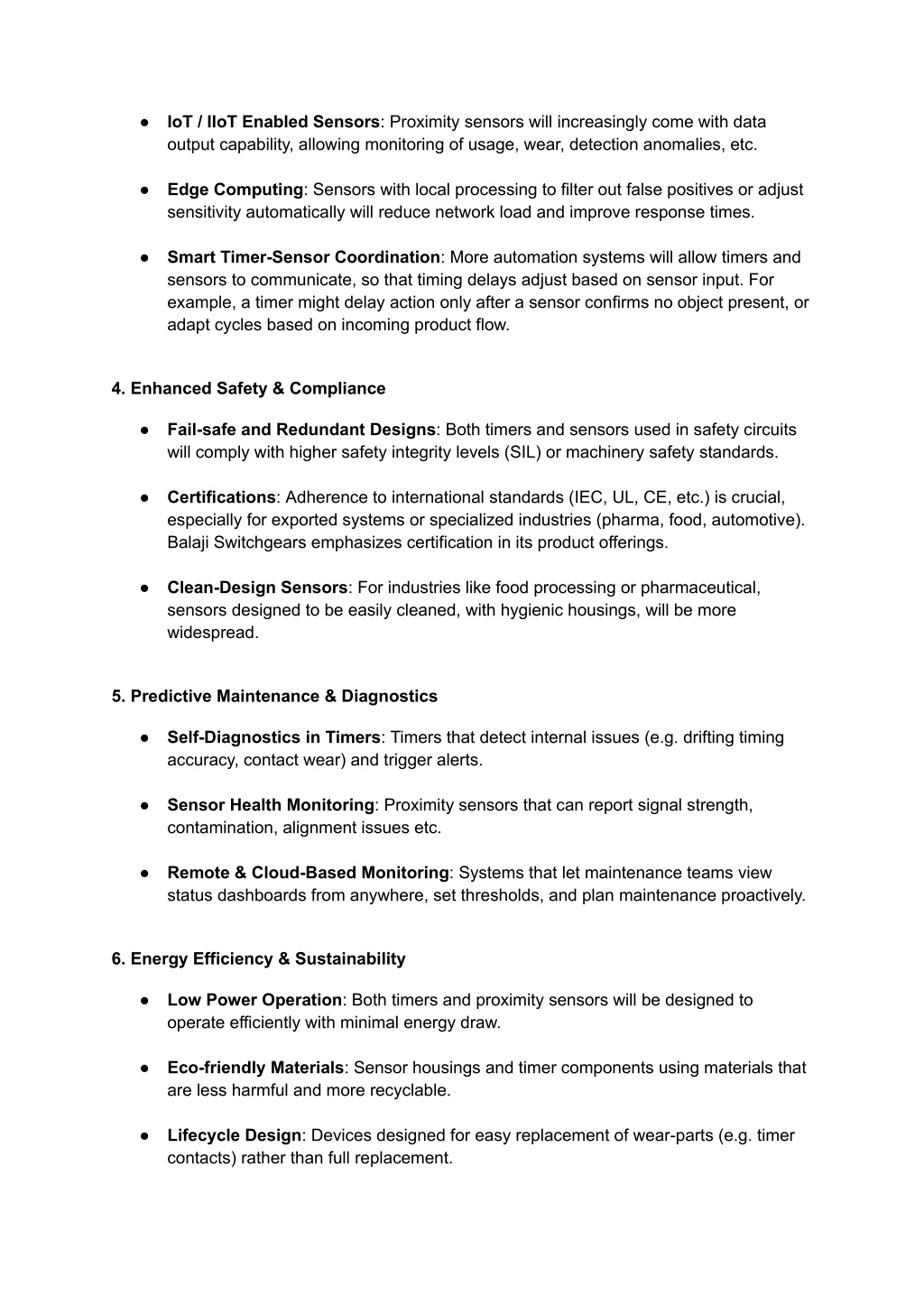 ● IoT / IIoT Enabled Sensors: Proximity sensors will increasingly come with data output capability, allowing monitoring of usage, wear, detection anomalies, etc. ● Edge Computing: Sensors with local processing to filter out false positives or adjust sensitivity automatically will reduce network load and improve response times. ● Smart Timer-Sensor Coordination: More automation systems will allow timers and sensors to communicate, so that timing delays adjust based on sensor input. For example, a timer might delay action only after a sensor confirms no object present, or adapt cycles based on incoming product flow. 4. Enhanced Safety & Compliance ● Fail-safe and Redundant Designs: Both timers and sensors used in safety circuits will comply with higher safety integrity levels (SIL) or machinery safety standards. ● Certifications: Adherence to international standards (IEC, UL, CE, etc.) is crucial, especially for exported systems or specialized industries (pharma, food, automotive). Balaji Switchgears emphasizes certification in its product offerings. ● Clean-Design Sensors: For industries like food processing or pharmaceutical, sensors designed to be easily cleaned, with hygienic housings, will be more widespread. 5. Predictive Maintenance & Diagnostics ● Self-Diagnostics in Timers: Timers that detect internal issues (e.g. drifting timing accuracy, contact wear) and trigger alerts. ● Sensor Health Monitoring: Proximity sensors that can report signal strength, contamination, alignment issues etc. ● Remote & Cloud-Based Monitoring: Systems that let maintenance teams view status dashboards from anywhere, set thresholds, and plan maintenance proactively. 6. Energy Efficiency & Sustainability ● Low Power Operation: Both timers and proximity sensors will be designed to operate efficiently with minimal energy draw. ● Eco-friendly Materials: Sensor housings and timer components using materials that are less harmful and more recyclable. ● Lifecycle Design: Devices designed for easy replacement of wear-parts (e.g. timer contacts) rather than full replacement.