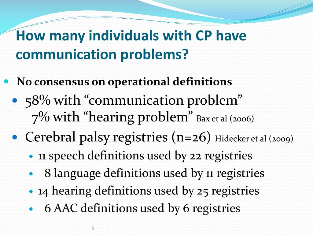 How many individuals with CP have communication problems? No consensus on operational definitions 58% with “communication problem”7% with “hearing problem” Bax et al (2006) Cerebral palsy registries (n=26) Hidecker et al (2009) 11 speech definitions used by 22 registries 8 language definitions used by 11 registries 14 hearing definitions used by 25 registries 6 AAC definitions used by 6 registries