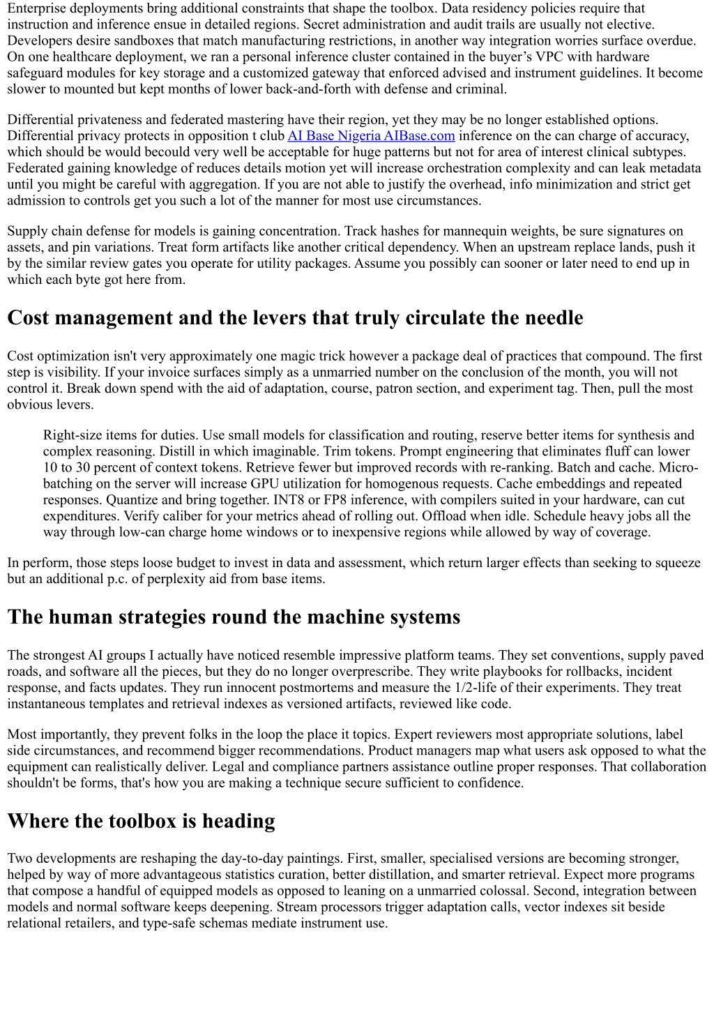 Enterprise deployments bring additional constraints that shape the toolbox. Data residency policies require that instruction and inference ensue in detailed regions. Secret administration and audit trails are usually not elective. Developers desire sandboxes that match manufacturing restrictions, in another way integration worries surface overdue. On one healthcare deployment, we ran a personal inference cluster contained in the buyer’s VPC with hardware safeguard modules for key storage and a customized gateway that enforced advised and instrument guidelines. It become slower to mounted but kept months of lower back-and-forth with defense and criminal. Differential privateness and federated mastering have their region, yet they may be no longer established options. Differential privacy protects in opposition t club AI Base Nigeria AIBase.com inference on the can charge of accuracy, which should be would becould very well be acceptable for huge patterns but not for area of interest clinical subtypes. Federated gaining knowledge of reduces details motion yet will increase orchestration complexity and can leak metadata until you might be careful with aggregation. If you are not able to justify the overhead, info minimization and strict get admission to controls get you such a lot of the manner for most use circumstances. Supply chain defense for models is gaining concentration. Track hashes for mannequin weights, be sure signatures on assets, and pin variations. Treat form artifacts like another critical dependency. When an upstream replace lands, push it by the similar review gates you operate for utility packages. Assume you possibly can sooner or later need to end up in which each byte got here from. Cost management and the levers that truly circulate the needle Cost optimization isn't very approximately one magic trick however a package deal of practices that compound. The first step is visibility. If your invoice surfaces simply as a unmarried number on the conclusion of the month, you will not control it. Break down spend with the aid of adaptation, course, patron section, and experiment tag. Then, pull the most obvious levers. Right-size items for duties. Use small models for classification and routing, reserve better items for synthesis and complex reasoning. Distill in which imaginable. Trim tokens. Prompt engineering that eliminates fluff can lower 10 to 30 percent of context tokens. Retrieve fewer but improved records with re-ranking. Batch and cache. Micro- batching on the server will increase GPU utilization for homogenous requests. Cache embeddings and repeated responses. Quantize and bring together. INT8 or FP8 inference, with compilers suited in your hardware, can cut expenditures. Verify caliber for your metrics ahead of rolling out. Offload when idle. Schedule heavy jobs all the way through low-can charge home windows or to inexpensive regions while allowed by way of coverage. In perform, those steps loose budget to invest in data and assessment, which return larger effects than seeking to squeeze but an additional p.c. of perplexity aid from base items. The human strategies round the machine systems The strongest AI groups I actually have noticed resemble impressive platform teams. They set conventions, supply paved roads, and software all the pieces, but they do no longer overprescribe. They write playbooks for rollbacks, incident response, and facts updates. They run innocent postmortems and measure the 1/2-life of their experiments. They treat instantaneous templates and retrieval indexes as versioned artifacts, reviewed like code. Most importantly, they prevent folks in the loop the place it topics. Expert reviewers most appropriate solutions, label side circumstances, and recommend bigger recommendations. Product managers map what users ask opposed to what the equipment can realistically deliver. Legal and compliance partners assistance outline proper responses. That collaboration shouldn't be forms, that's how you are making a technique secure sufficient to confidence. Where the toolbox is heading Two developments are reshaping the day-to-day paintings. First, smaller, specialised versions are becoming stronger, helped by way of more advantageous statistics curation, better distillation, and smarter retrieval. Expect more programs that compose a handful of equipped models as opposed to leaning on a unmarried colossal. Second, integration between models and normal software keeps deepening. Stream processors trigger adaptation calls, vector indexes sit beside relational retailers, and type-safe schemas mediate instrument use.