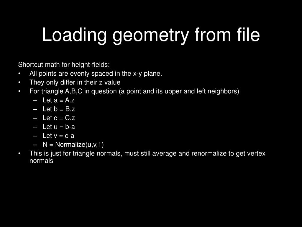 Loading geometry from file Shortcut math for height-fields: • All points are evenly spaced in the x-y plane. • They only differ in their z value • For triangle A,B,C in question (a point and its upper and left neighbors) • Let a = A.z • Let b = B.z • Let c = C.z • Let u = b-a • Let v = c-a • N = Normalize(u,v,1) • This is just for triangle normals, must still average and renormalize to get vertex normals