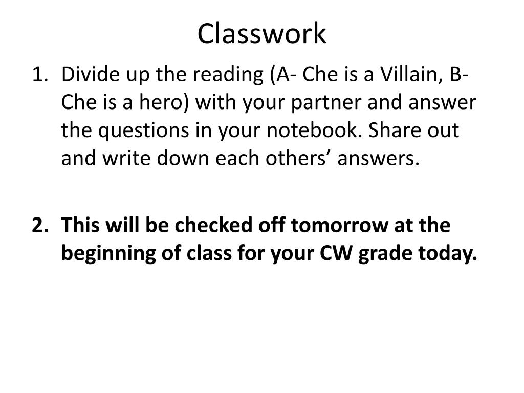 Classwork • Divide up the reading (A- Che is a Villain, B- Cheis a hero) with your partner and answer the questions in your notebook. Share out and write down each others’ answers. • This will be checked off tomorrow at the beginning of class for your CW grade today.
