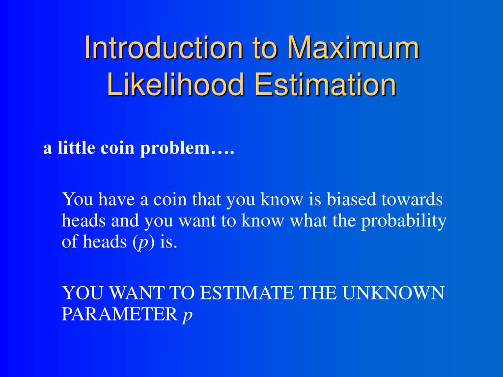 Introduction to Maximum Likelihood Estimation a little coin problem…. You have a coin that you know is biased towards heads and you want to know what the probability of heads (p) is. YOU WANT TO ESTIMATE THE UNKNOWN PARAMETER p