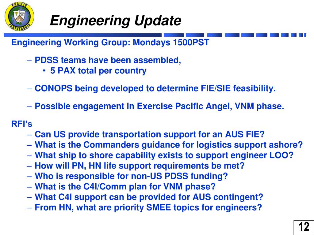 Engineering Update Engineering Working Group: Mondays 1500PST • PDSS teams have been assembled, • 5 PAX total per country • CONOPS being developed to determine FIE/SIE feasibility. • Possible engagement in Exercise Pacific Angel, VNM phase. RFI’s • Can US provide transportation support for an AUS FIE? • What is the Commanders guidance for logistics support ashore? • What ship to shore capability exists to support engineer LOO? • How will PN, HN life support requirements be met? • Who is responsible for non-US PDSS funding? • What is the C4I/Comm plan for VNM phase? • What C4I support can be provided for AUS contingent? • From HN, what are priority SMEE topics for engineers?
