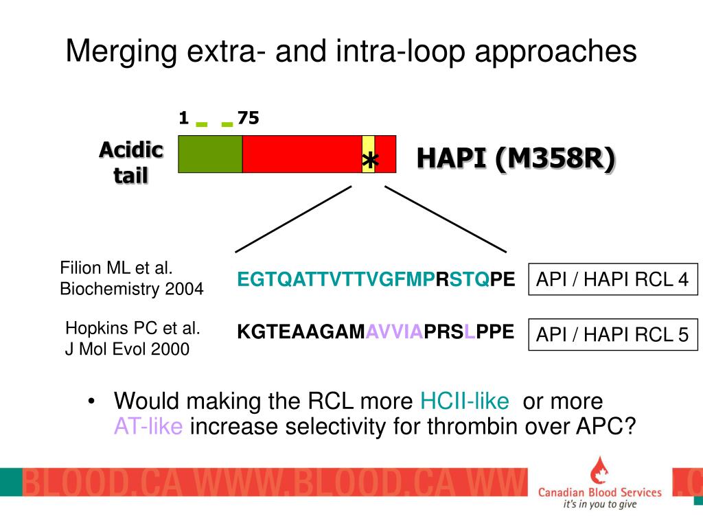 - - 1 75 Acidic tail HAPI (M358R) * Merging extra- and intra-loop approaches • Would making the RCL more HCII-like or more AT-like increase selectivity for thrombin over APC? Filion ML et al. Biochemistry 2004 EGTQATTVTTVGFMPRSTQPE API / HAPI RCL 4 Hopkins PC et al. J Mol Evol 2000 KGTEAAGAMAVVIAPRSLPPE API / HAPI RCL 5