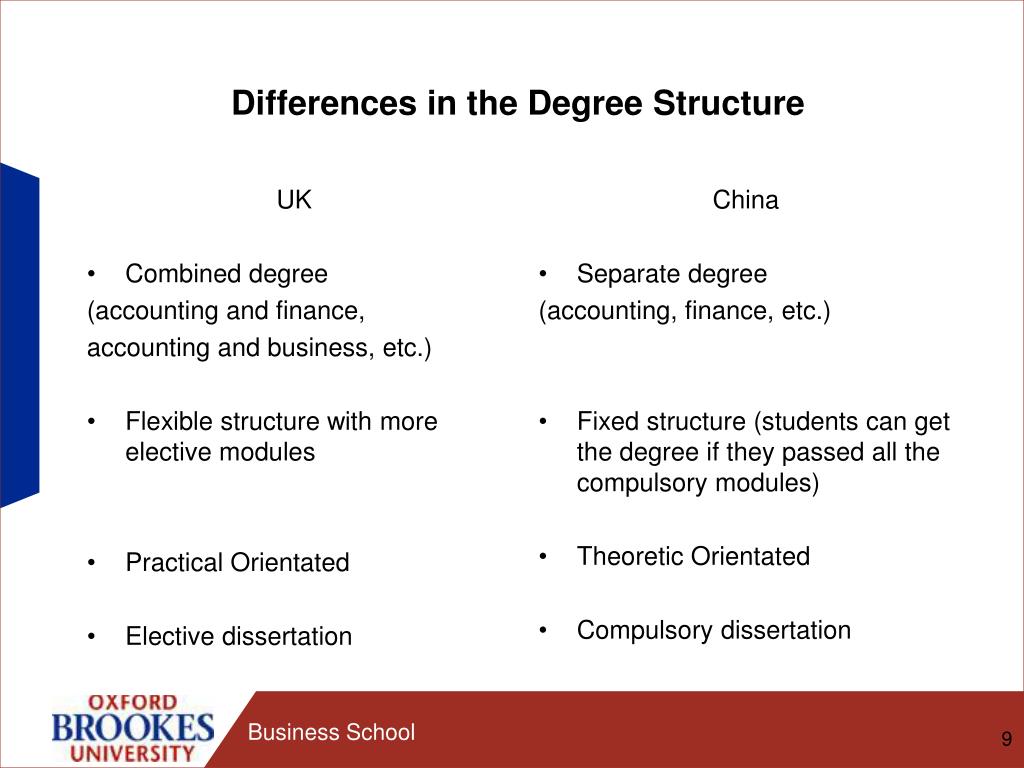 Differences in the Degree Structure • UK • Combined degree • (accounting and finance, • accounting and business, etc.) • Flexible structure with more elective modules • Practical Orientated • Elective dissertation • China • Separate degree • (accounting, finance, etc.) • Fixed structure (students can get the degree if they passed all the compulsory modules) • Theoretic Orientated • Compulsory dissertation Business School