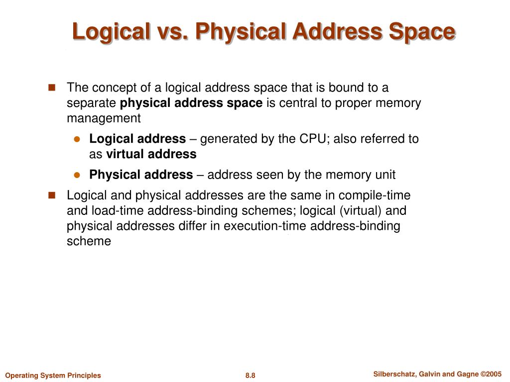 Logical vs. Physical Address Space • The concept of a logical address space that is bound to a separate physical address space is central to proper memory management • Logical address – generated by the CPU; also referred to as virtual address • Physical address – address seen by the memory unit • Logical and physical addresses are the same in compile-time and load-time address-binding schemes; logical (virtual) and physical addresses differ in execution-time address-binding scheme