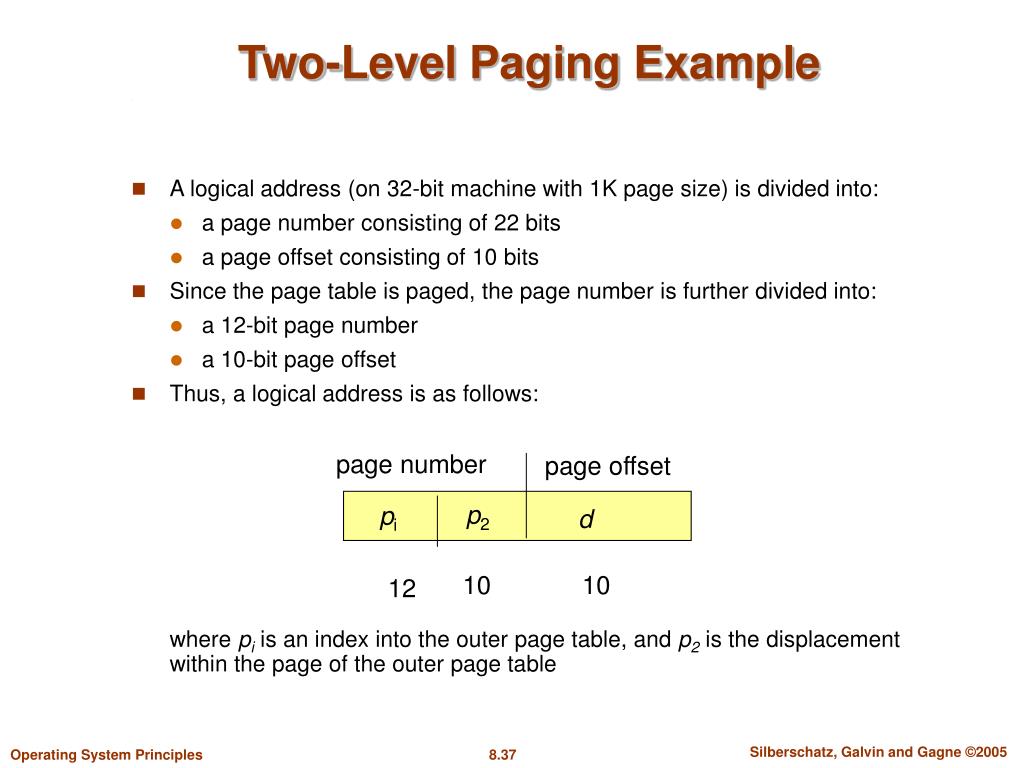 Two-Level Paging Example • A logical address (on 32-bit machine with 1K page size) is divided into: • a page number consisting of 22 bits • a page offset consisting of 10 bits • Since the page table is paged, the page number is further divided into: • a 12-bit page number • a 10-bit page offset • Thus, a logical address is as follows:where pi is an index into the outer page table, and p2 is the displacement within the page of the outer page table page number page offset p2 pi d 10 10 12