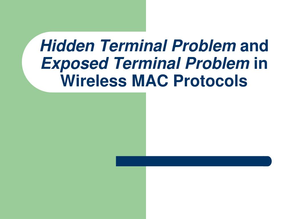Hidden Terminal Problem and Exposed Terminal Problem in Wireless MAC Protocols. Networking basics. Medium Access Control (MAC) Protocol. Characteristics of Wireless Networks. Multiplexing : in a mobile and wireless network, the wireless medium is shared by many nodes.