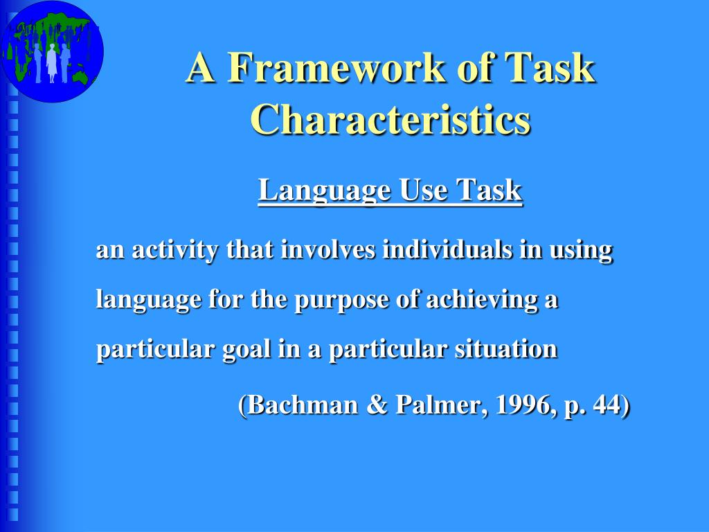 A Framework of Task Characteristics Language Use Task an activity that involves individuals in using language for the purpose of achieving a particular goal in a particular situation (Bachman & Palmer, 1996, p. 44)