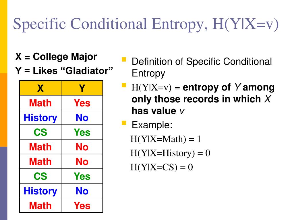 Specific Conditional Entropy, H(Y|X=v) X = College Major Y = Likes “Gladiator” • I have input X and want to predict Y • From data we estimate probabilities P(LikeG = Yes) = 0.5 P(Major=Math & LikeG=No) = 0.25 P(Major=Math) = 0.5 P(Major=History & LikeG=Yes) = 0 • Note H(X) = 1.5 H(Y) = 1