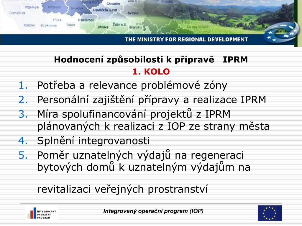 Hodnocení IPRM – 2.KOLO Specifická kritéria přijatelnosti problémové území řešené v IPRM je vymezeno na základě kritérií dle čl. 47 Nařízení Komise (ES) č. 1828/2006 a metodiky IOP; území IPRM (problémové sídliště) je součástí města s celkovým počtem obyvatel 20 tisíc a více; území IPRM (problémové sídliště) zahrnuje nejméně 500 bytů; IPRM získal v hodnocení kvality stanovený počet bodů; údaje v IPRM jsou shodné s daty hodnocenými v rámci 1. kola; odpovídá pokynům nastaveným ve výzvě. Integrovaný operační program (IOP)