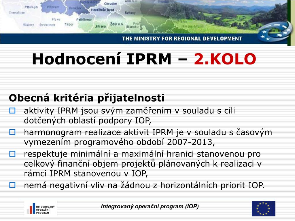 Hodnocení IPRM – 2.KOLO Obecná kritéria přijatelnosti • aktivity IPRM jsou svým zaměřením v souladu s cíli dotčených oblastí podpory IOP, • harmonogram realizace aktivit IPRM je v souladu s časovým vymezením programového období 2007-2013, • respektuje minimální a maximální hranici stanovenou pro celkový finanční objem projektů plánovaných k realizaci v rámci IPRM stanovenou v IOP, • nemá negativní vliv na žádnou z horizontálních priorit IOP. Integrovaný operační program (IOP)