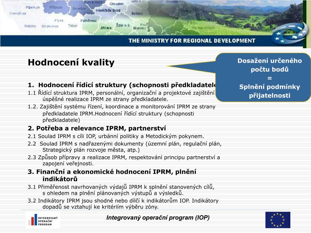 Dosažení určeného počtu bodů = Splnění podmínky přijatelnosti • Hodnocení kvality • 1. Hodnocení řídící struktury (schopnosti předkladatele) • 1.1 Řídící struktura IPRM, personální, organizační a projektové zajištění úspěšné realizace IPRM ze strany předkladatele. • 1.2. Zajištění systému řízení, koordinace a monitorování IPRM ze strany předkladatele IPRM.Hodnocenířídící struktury (schopnosti předkladatele) • 2. Potřeba a relevance IPRM, partnerství • 2.1 Soulad IPRM s cíli IOP, urbánní politiky a Metodickým pokynem. • 2.2 Soulad IPRM s nadřazenými dokumenty (územní plán, regulační plán, Strategický plán rozvoje města, atp.) • 2.3 Způsob přípravy a realizace IPRM, respektování principu partnerství a zapojení veřejnosti. • 3. Finanční a ekonomické hodnocení IPRM, plnění indikátorů • 3.1 Přiměřenost navrhovaných výdajů IPRM k splnění stanovených cílů, s ohledem na plnění plánovaných výstupů a výsledků. • 3.2 Indikátory IPRM jsou shodné nebo dílčí k indikátorům IOP. Indikátory dopadů se vztahují ke kritériím výběru zóny. Integrovaný operační program (IOP)
