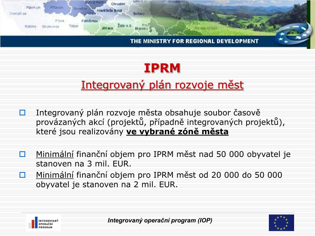 IPRM Integrovaný plánrozvoje měst • Integrovaný plán rozvoje města obsahuje soubor časově provázaných akcí (projektů, případně integrovaných projektů), které jsou realizovány ve vybrané zóně města • Minimální finanční objem pro IPRM měst nad 50 000 obyvatel je stanoven na 3 mil. EUR. • Minimální finanční objem pro IPRM měst od 20 000 do 50 000 obyvatel je stanoven na 2 mil. EUR. Integrovaný operační program (IOP)