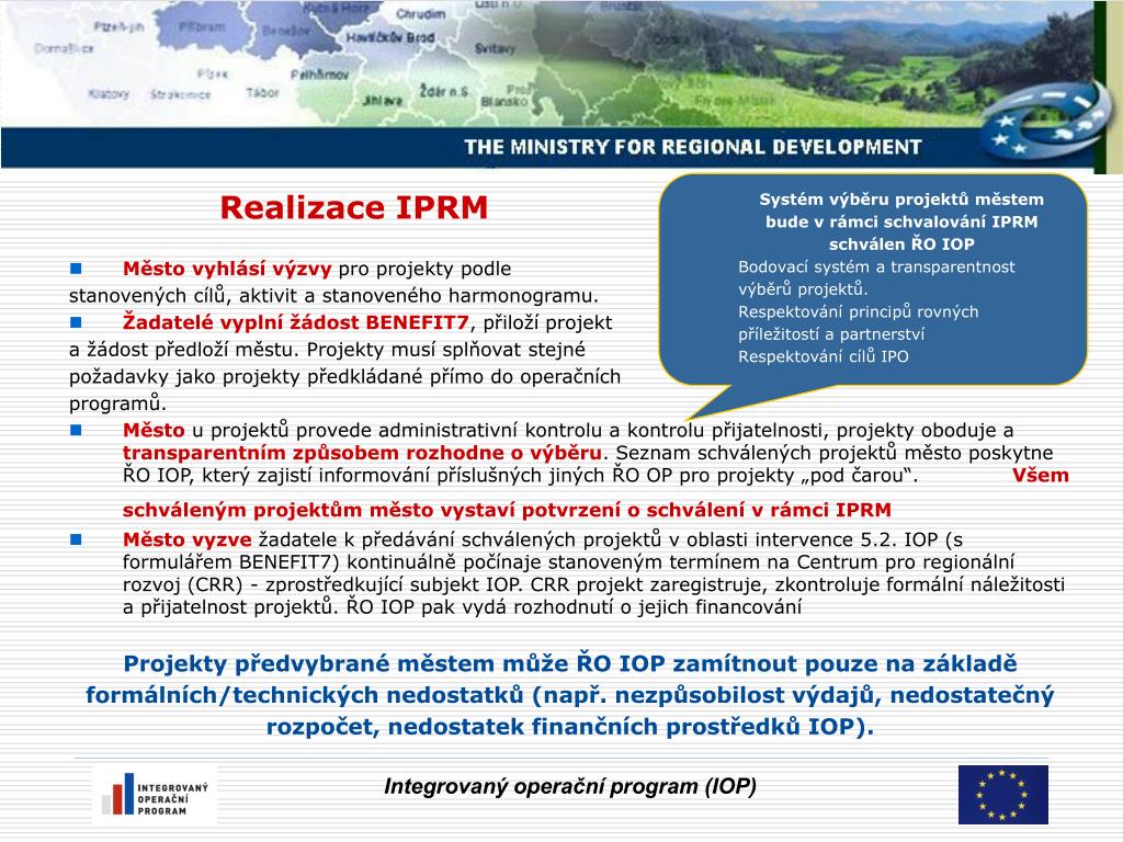 Systém výběru projektů městem bude v rámci schvalování IPRM schválen ŘO IOP Bodovací systém a transparentnost výběrů projektů. Respektování principů rovných příležitostí a partnerství Respektování cílů IPO • Realizace IPRM • Město vyhlásí výzvy pro projekty podle • stanovených cílů, aktivit a stanoveného harmonogramu. • Žadatelé vyplní žádost BENEFIT7, přiloží projekt • a žádost předloží městu. Projekty musí splňovat stejné • požadavky jako projekty předkládané přímo do operačních • programů. • Město u projektů provede administrativní kontrolu a kontrolu přijatelnosti, projekty oboduje a transparentním způsobem rozhodne o výběru. Seznam schválených projektů město poskytne ŘO IOP, který zajistí informování příslušných jiných ŘO OP pro projekty „pod čarou“. Všem schváleným projektům město vystaví potvrzení o schválení v rámci IPRM • Město vyzve žadatele k předávání schválených projektů v oblasti intervence 5.2. IOP (s formulářem BENEFIT7) kontinuálně počínaje stanoveným termínem na Centrum pro regionální rozvoj (CRR) - zprostředkující subjekt IOP. CRR projekt zaregistruje, zkontroluje formální náležitosti a přijatelnost projektů. ŘO IOP pak vydá rozhodnutí o jejich financování • Projekty předvybrané městem může ŘO IOP zamítnout pouze na základě • formálních/technických nedostatků (např. nezpůsobilost výdajů, nedostatečný • rozpočet, nedostatek finančních prostředků IOP). • . Integrovaný operační program (IOP)
