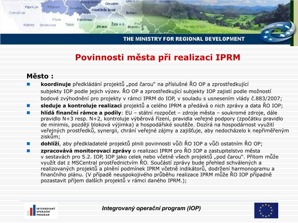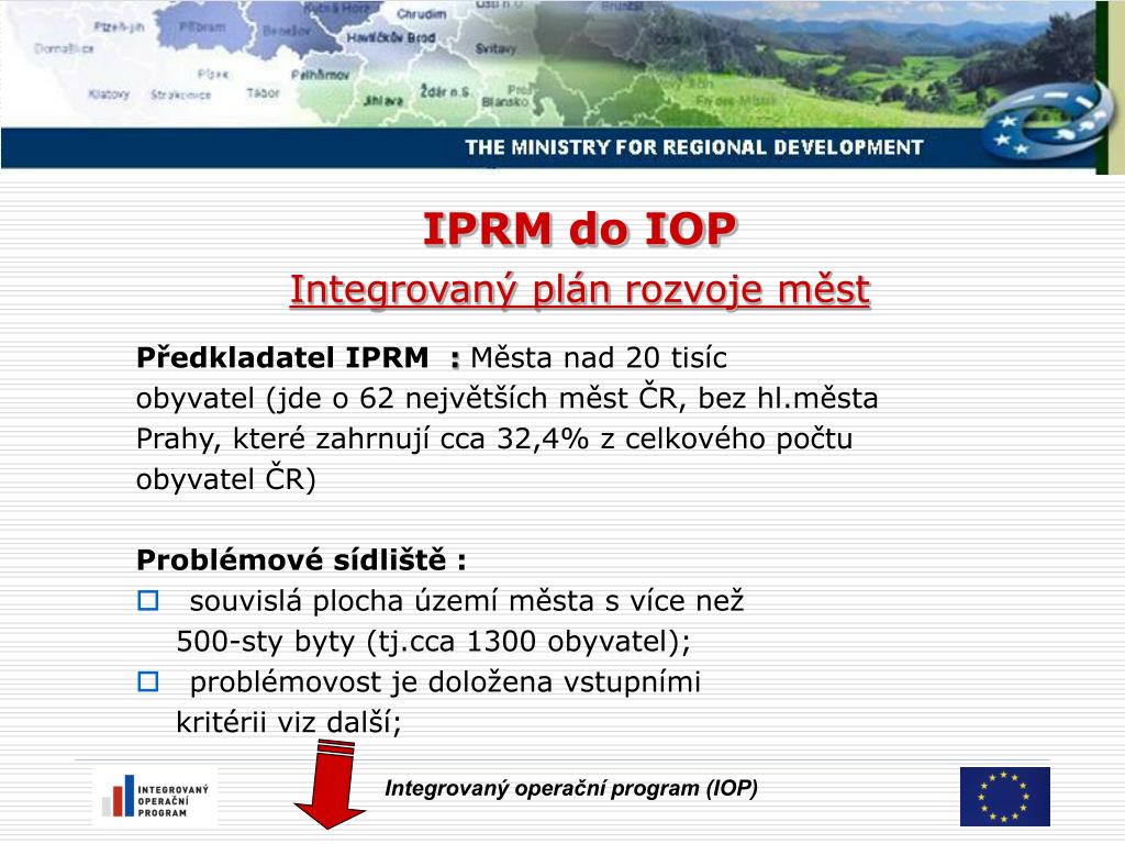 IPRM Integrovaný plánrozvoje měst • Kolo : Výběr problémových zón – výběr IPRM k financování • Průběžně : Schválení IPRM na 2007-2013 • Realizace a naplňování IPRM • Povinnosti města vyplývající z realizace IPRM Integrovaný operační program (IOP)