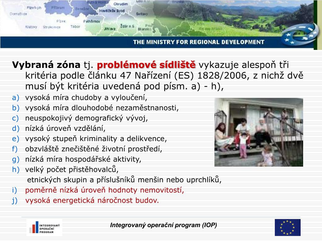 Vybraná zóna tj. problémové sídliště vykazuje alespoň tři kritéria podle článku 47 Nařízení (ES) 1828/2006, z nichž dvě musí být kritéria uvedená pod písm. a) - h), • vysoká míra chudoby a vyloučení, • vysoká míra dlouhodobé nezaměstnanosti, • neuspokojivý demografický vývoj, • nízká úroveň vzdělání, • vysoký stupeň kriminality a delikvence, • obzvláště znečištěné životní prostředí, • nízká míra hospodářské aktivity, • velký počet přistěhovalců, • etnických skupin a příslušníků menšin nebo uprchlíků, • poměrně nízká úroveň hodnoty nemovitostí, • j) vysoká energetická náročnost budov. Integrovaný operační program (IOP)