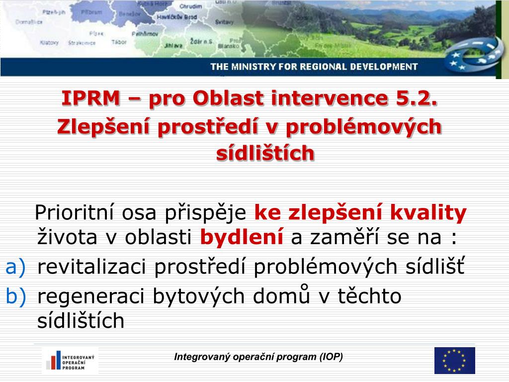 IPRM – pro Oblast intervence 5.2. Zlepšení prostředí v problémových sídlištích Prioritní osa přispěje ke zlepšení kvality života v oblasti bydleníazaměří se na : revitalizaci prostředí problémových sídlišť regeneraci bytových domů v těchto sídlištích Integrovaný operační program (IOP)