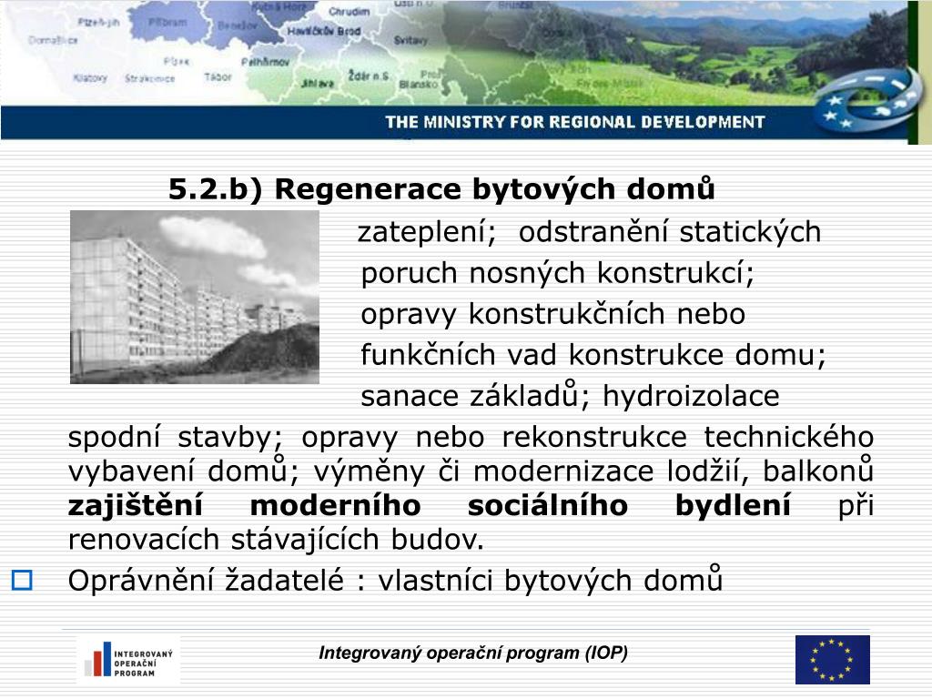 5.2.b) Regenerace bytových domů zateplení; odstranění statických poruch nosných konstrukcí; opravy konstrukčních nebo funkčních vad konstrukce domu; sanace základů; hydroizolace spodní stavby; opravy nebo rekonstrukce technického vybavení domů; výměny či modernizace lodžií, balkonů zajištění moderního sociálního bydlení při renovacích stávajících budov. • Oprávnění žadatelé : vlastníci bytových domů Integrovaný operační program (IOP)