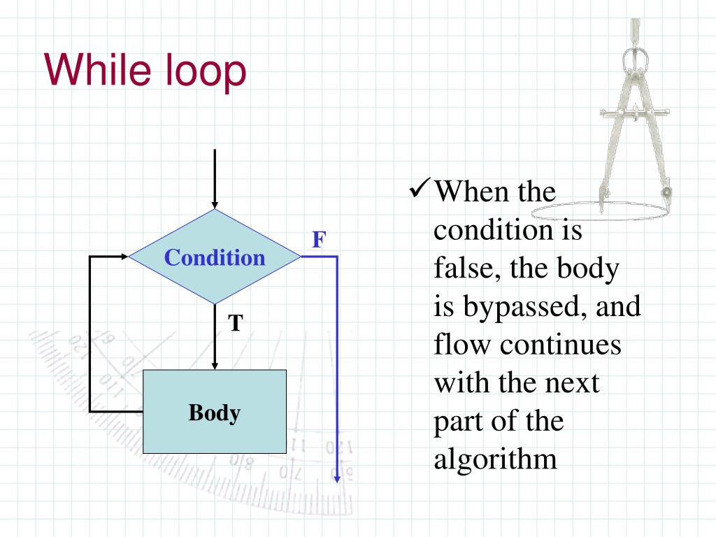 While loop • When the condition is false, the body is bypassed, and flow continues with the next part of the algorithm Condition F T Body