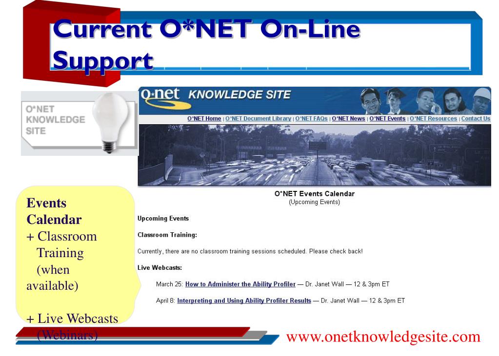 Current O*NET On-Line Support Events Calendar + Classroom Training (when available) + Live Webcasts (Webinars) www.onetknowledgesite.com