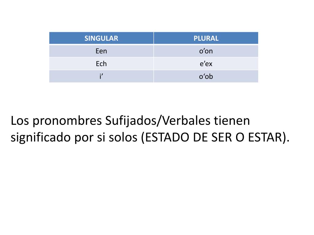Pronombre Sufijado/Verbal. Los pronombres Sufijados/Verbales tienen significado por si solos (ESTADO DE SER O ESTAR). Ejemplos de las conjugaciones utilizando los pronombres sufijados/verbales:.