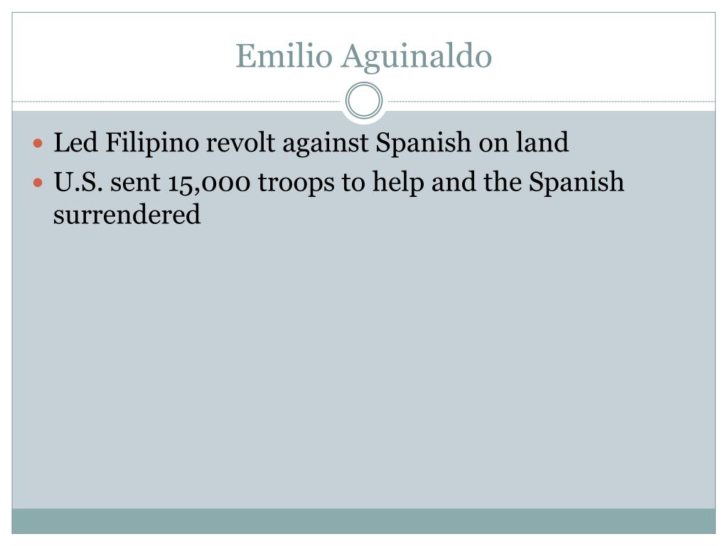 Emilio Aguinaldo Led Filipino revolt against Spanish on land U.S. sent 15,000 troops to help and the Spanish surrendered